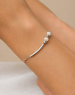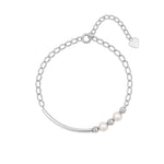 Grace meets simplicity in this elegant 925 sterling silver chain bracelet, featuring three luminous pearls nestled between textured silver spacers. The half-bangle silhouette transitions into a delicate adjustable chain, finished with a tiny heart charm—making it perfect for layering or wearing solo.