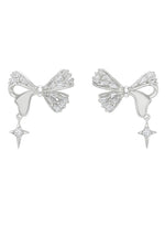 Add a playful sparkle to your style with these elegant bow stud earrings from Svetaka. Crafted in 925 sterling silver with a high-shine rhodium finish, these earrings feature a delicate bow design encrusted with shimmering tapered baguette and round-cut zircon stones. A dainty star-shaped zircon drop adds movement and charm, making them perfect for both casual and festive occasions.
