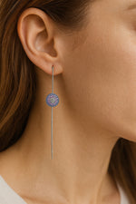 Make a bold yet graceful statement with these modern sterling silver threader earrings, featuring a sparkling round disc charm encrusted with micro-pave purple and blue stones. The sleek threader chain design allows for adjustable length and movement, giving the earrings a fluid, sophisticated finish. Lightweight and versatile, they bring a pop of colour and a contemporary edge to any outfit.