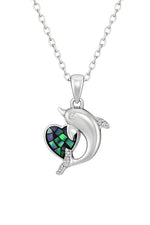 Celebrate the beauty of the ocean with this 925 sterling silver dolphin pendant necklace, featuring a graceful dolphin playfully embracing a heart-shaped charm. The heart showcases a stunning blue-green mosaic inlay with a realistic tile-like texture, while the dolphin is accented with sparkling zirconia stones on its fin and tail. Suspended from a fine silver chain, this piece captures the elegance of marine life and the joy of the sea.