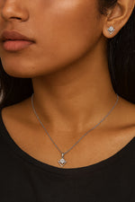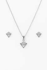 Make a bold style statement with this 925 sterling silver geometric jewellery set, featuring a striking inverted triangle frame adorned with a dazzling floral cluster of high-quality zirconia. The pendant hangs gracefully on a sleek silver chain, perfectly complemented by matching stud earrings for a coordinated and contemporary look. Designed for modern women who love minimalist yet eye-catching jewellery, this set is perfect for work, parties, and special occasions.