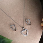 Celebrate love and elegance with this 925 sterling silver open heart pendant necklace and matching earrings set. Featuring a delicate hollow heart outline encrusted with sparkling zircon stones, this jewellery set adds just the right touch of sophistication and shine. The pendant necklace is paired with matching heart-shaped earrings, making it a versatile accessory for both everyday wear and special occasions. Crafted from high-quality sterling silver, this set is lightweight, durable, and hypoallergenic, ensuring comfort while keeping its radiant sparkle for years.