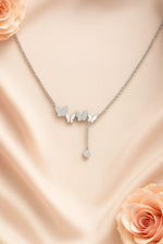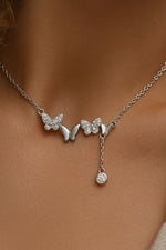 Graceful and full of charm, the Flutterfall Silver Necklace captures the delicate motion of butterflies in flight. Crafted in 925 sterling silver, this elegant piece features four intricately detailed butterfly motifs, two of which are studded with sparkling cubic zirconia. A single dainty drop with a crystal accent completes the look, adding movement and elegance.