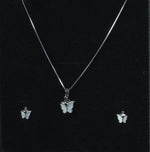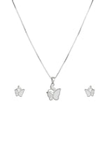 Celebrate grace and femininity with this dainty butterfly pendant and earring set from Svetaka, crafted in pure 925 sterling silver. The enchanting design features a dual-winged butterfly motif, with one wing adorned in shimmering zircon stones and the other finished in glossy white enamel — striking the perfect balance between sparkle and softness.