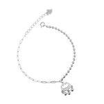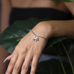 Celebrate grace and tradition with this unique 925 sterling silver bracelet, featuring a beautifully crafted dome-shaped charm accented with delicate cut-out detailing. The charm is enhanced by tiny silver beads that dangle gracefully, creating subtle movement and an elegant jingle with every gesture.